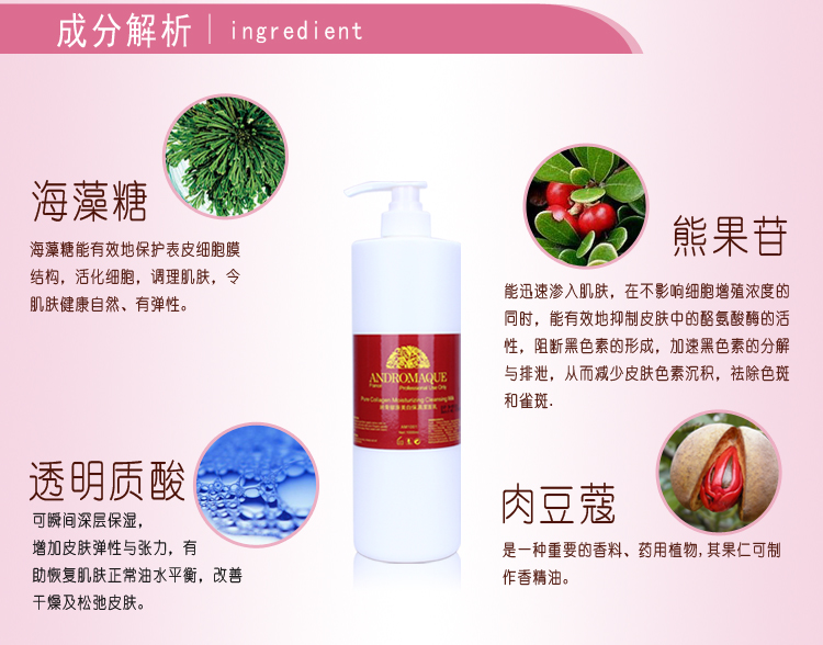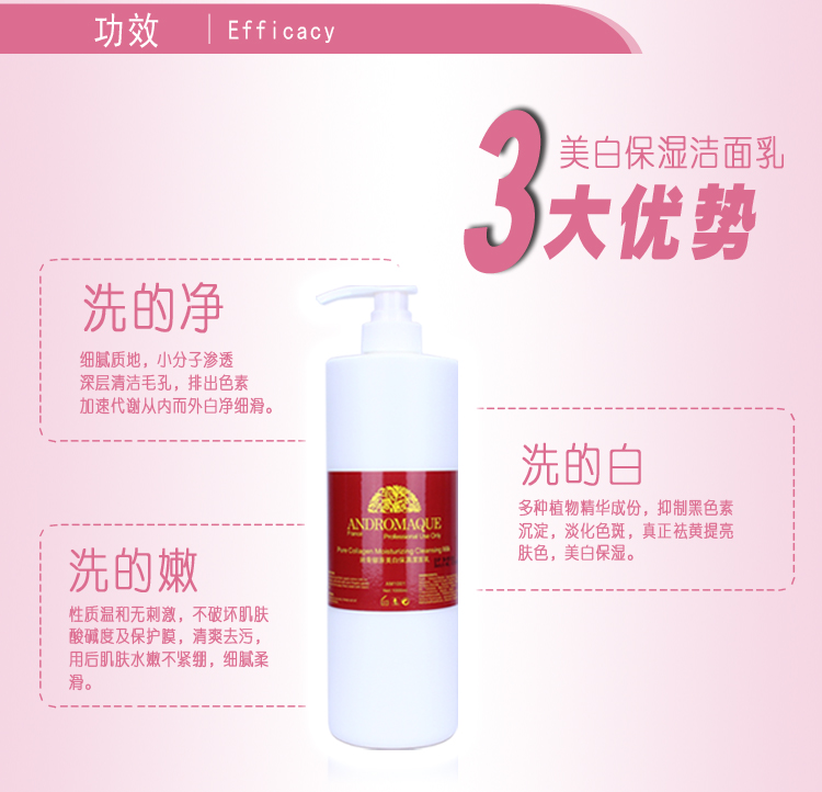 徹底潔淨臉部污垢,具有溫和滋潤,清爽潔膚功效,蘊含的純骨膠原能有效補充皮膚所流失的膠原蛋白,增加皮膚的彈性,減少皺紋,改善鬆弛現象,使粗糙的皮膚變得細膩,平滑富有彈性。